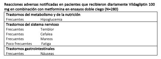 Descripción de algunas reacciones adversas: En los ensayos clínicos controlados de la combinación de 100 mg diarios de vildagliptin + metformina, no se notificaron interrupciones del tratamiento debidas a reacciones adversas en los grupos tratados con 100 mg diarios de vildagliptin + metformina o con placebo + metformina. En los ensayos clínicos la incidencia de hipoglucemia fue frecuente en pacientes que recibieron 100 mg diarios de vildagliptin una vez al día en combinación con metformina (1%) y poco frecuente en pacientes que recibieron placebo + metformina (0,4%). No se notificaron episodios hipoglucémicos graves en los brazos de tratamiento con vildagliptin. En los ensayos clínicos no se modificó el peso corporal respecto al valor basal al añadir 100 mg diarios de vildagliptin a metformina (+0,2 kg y -1,0 kg para vildagliptin y placebo, respectivamente). Los ensayos clínicos de más de 2 años de duración no indicaron ninguna señal de seguridad adicional o riesgo imprevisto cuando se añadió vildagliptin a metformina. Combinación con una sulfonilurea: