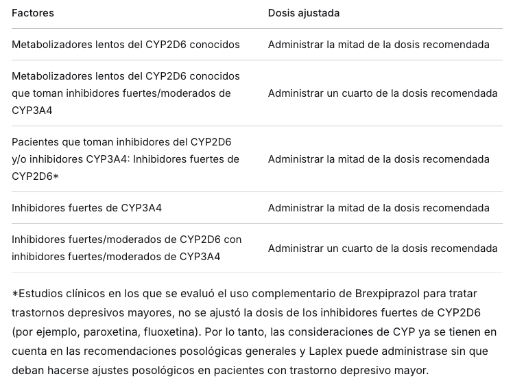 Posología: Tratamiento de la Esquizofrenia: La dosis inicial recomendada es de 1 mg de Brexpiprazol, una vez al día, en los días 1 a 4. En base a la respuesta clínica y tolerabilidad del paciente, la dosis de Brexpiprazol se puede incrementar a 2 mg una vez al día, del día 5 al día 7 y luego, a 4 mg en el día 8. El rango de dosis recomendada es de 2 a 4 mg, una vez al día. Dosis máxima: La dosis diaria máxima recomendada es de 4 mg. Tratamiento complementario de Trastornos Depresivos Mayores: La dosis inicial recomendada, como tratamiento complementario, es de 0,5 mg ó 1 mg de Brexpiprazol, una vez al día por vía oral, con o sin comida. Ajustar la dosis a 1 mg una vez al día, y luego, a la dosis objetivo de 2 mg una vez al día. El incremento de la dosis debería realizarse a intervalos semanales, en base a la respuesta clínica y tolerabilidad del paciente. Dosis máxima: La dosis diaria máxima recomendada es de 3 mg. Se recomienda realizar una evaluación periódica del paciente para determinar la necesidad de continuar administrando el medicamento o la dosis adecuada para el tratamiento. Cambio de otro antipsicótico a Brexpiprazol: Al cambiar desde otros antipsicóticos a Brexpiprazol, se debe considerar el ajuste de dosis cruzado gradual, con una interrupción gradual del tratamiento previo mientras se inicia el tratamiento con Brexpiprazol. Cambio a otros antipsicóticos después de recibir Brexpiprazol: Al cambiar a otros antipsicóticos desde Brexpiprazol, no se necesita un ajuste de dosis cruzado gradual, y el nuevo antipsicótico puede iniciarse a su dosis más baja mientras que el tratamiento con Brexpiprazol se discontinúa. Se debe considerar que la concentración plasmática de Brexpiprazol disminuirá gradualmente y se eliminará por completo en 1 a 2 semanas. Poblaciones especiales: Pacientes de edad avanzada: No se ha establecido la seguridad y eficacia de Brexpiprazol en el tratamiento de la esquizofrenia en pacientes de 65 años o mayores. No es posible recomendar una dosis mínima eficaz/segura en esta población. Insuficiencia renal: En pacientes con insuficiencia renal moderada a severa (clearance de creatinina < 60 ml/min.), la dosis máxima recomendada de Brexpiprazol, es de 2 mg una vez al día, para pacientes con trastornos depresivos mayores, y de 3 mg una vez al día, para pacientes con esquizofrenia. Insuficiencia hepática: En pacientes con insuficiencia hepática moderada a grave (puntaje ≥7 de Child-Pugh), la dosis máxima recomendada es de 2 mg una vez al día, para pacientes con trastornos depresivos mayores, y de 3 mg una vez al día, para pacientes con esquizofrenia. Metabolizadores lentos de CYP2D6: Se requieren modificaciones de la dosis hasta la mitad de las dosis recomendadas para los pacientes con un metabolismo lento conocido del CYP2D6. Se requieren modificaciones posológicas adicionales hasta un cuarto de la dosis recomendada, para los metabolizadores lentos del CYP2D6 conocidos, mientras se toman inhibidores potentes o moderados del CYP3A4. Ajustes de dosis debido a interacciones medicamentosas: Se deben realizar ajustes de dosis en pacientes quienes tomen concomitantemente inhibidores o inductores fuertes del CYP3A4 o inhibidores fuertes del CYP2D6. Si se suspenden los inhibidores o inductores del CYP3A4 o los inhibidores del CYP2D6, puede ser necesario restituir la dosis original. En caso de reacciones adversas, a pesar de los ajustes de dosis de Brexpiprazol, se deberá re-evaluar la necesidad del uso concomitante de Laplex e inhibidores del CYP2D6 o CYP3A4. La siguiente tabla muestra los ajustes a la dosis de Laplex en pacientes metabolizadores lentos del CYP2D6 y quienes reciben concomitantemente inhibidores del CYP:
