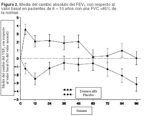 Pulmozyme también mejoró la calidad de vida, evaluada mediante el cambio en los puntajes de los síntomas relacionados con la fibrosis quística, los días de ingreso hospitalario, la evaluación de la disnea (una vez por día), la estimación del bienestar (una vez por día) y de los días de ausentismo escolar por enfermedad (una vez por día). Pacientes de 6-10 años con una FVC > 85% de la normal: Tras 2 años de tratamiento con 2,5 mg de Pulmozyme una vez por día administrado con el nebulizador Durable SideStream provisto de un compresor PortaNeb, el beneficio terapéutico en el FEV1 en los pacientes tratados con Pulmozyme en comparación con placebo era del 3,2 ± 1,2% del valor normal (p = 0,006). Se observó un aumento del FEV1 tras ≤ 48 semanas de tratamiento; a los 2 años, los pacientes tratados con Pulmozyme mantenían el FEV1 en su valor inicial, mientras que los del grupo de referencia mostraron una reducción media con respecto al valor basal (Figura 2).