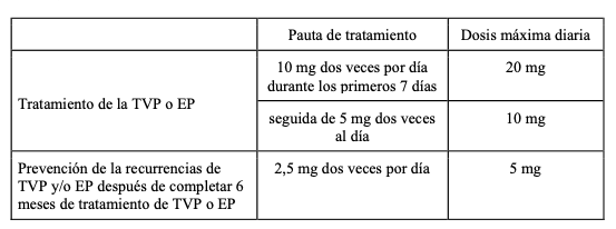 La dosis se adaptará según criterio médico al cuadro clínico del paciente. Como posología habitual de orientación se aconseja: Prevención del TEV en cirugía electiva de reemplazo de cadera o rodilla: La dosis recomendada de Apixabán es de 2,5 mg administrados dos veces al día por vía oral. La dosis inicial debe tomarse entre 12 y 24 horas después de la intervención quirúrgica. Para decidir el momento de administración en esta ventana de tiempo, los médicos deben considerar tanto los beneficios potenciales de un inicio temprano en el tratamiento para la profilaxis del TEV como el riesgo de sangrado posquirúrgico. En pacientes sometidos a cirugía de reemplazo de cadera: La duración recomendada del tratamiento es de 32 a 38 días. En pacientes sometidos a cirugía de reemplazo de rodilla: La duración recomendada del tratamiento es de 10 a 14 días. Prevención del accidente cerebrovascular y de la embolia sistémica en pacientes con fibrilación auricular no valvular (FANV): La dosis recomendada de Apixabán es de 5 mg administrados dos veces al día por vía oral. Reducción de dosis: La dosis recomendada de Apixabán es 2,5 mg administrados dos veces al día para pacientes con FANV y al menos dos de las siguientes características: edad ≥ 80 años, peso corporal ≤ 60 kg o creatinina sérica ≥ 1,5 mg/dl. El tratamiento debe mantenerse a largo plazo. Tratamiento de la TVP, tratamiento de la EP y prevención de las recurrencias de la TVP y de la EP: La dosis recomendada de Apixabán para el tratamiento de la TVP aguda y el tratamiento de la EP es de 10 mg dos veces al día por vía oral, durante los primeros 7 días, seguida de 5 mg dos veces al día por vía oral. De acuerdo con las guías médicas disponibles, la duración corta del tratamiento (como mínimo de 3 meses) se debe basar en factores de riesgo transitorios (como por ejemplo cirugía reciente, traumatismo, inmovilización). La dosis recomendada de Apixabán para la prevención de las recurrencias de la TVP y de la EP es de 2,5 mg dos veces al día por vía oral. Cuando esté indicada la prevención de las recurrencias de la TVP y de la EP, se debe iniciar con 2,5 mg dos veces al día después de completar 6 meses de tratamiento con Apixabán 5 mg dos veces al día o con otro anticoagulante, tal como se indica en la siguiente tabla: