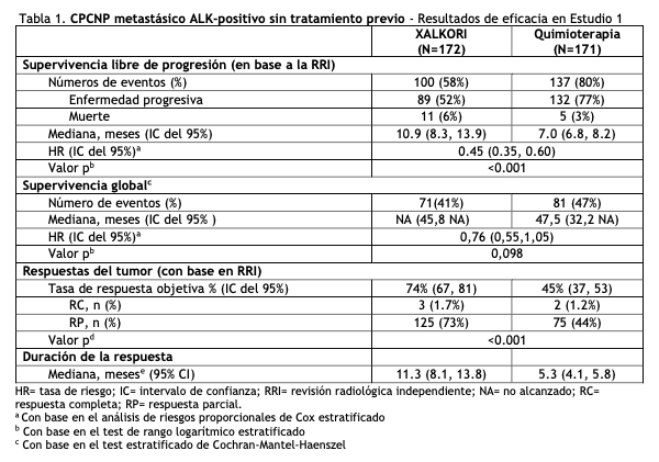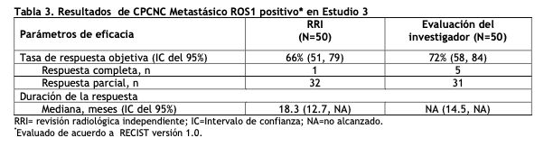CPCNP metastásico ROS1 positivo - Estudio 3 (Perfil 1001, NCT00585195): La eficacia y seguridad de XALKORI fue investigada en un estudio multicéntrico, de una sola rama (Estudio 3), en el que pacientes con CPCNP metastásico con reordenamiento de ROS 1 recibieron XALKORI 250 mg por vía oral dos veces al día. Era necesario que los pacientes tuvieran CPCNP avanzado confirmado por histología ROS 1 positivo, 18 años o mayor, estado de desempeño basal ECOG de 0, 1 o 2, y enfermedad medible. El resultado de eficacia fue TRO y DDR de acuerdo al RECIST versión 1.0, según la evaluación de la RRI y del investigador, con imagen radiológica cada 8 semanas durante las primeras 60 semanas. Las características demográficas y de enfermedad fueron mujeres (56%), mediana de edad 53 años, valor basal del estado de desempeño (ECOG) 0 o 1 (98%), raza blanca 54% y asiática 42%, 22% ex fumadores, 78% no fumadores, 92% con enfermedad metastásica, 96% con adenocarcinoma, 14 % no recibieron quimioterapia sistémica para enfermedad metastásica y 80% recibieron quimioterapia previa basada en platino para enfermedad metastásica. El estado ROS1 fue determinado sobre las muestras de tejido de CPCNP por FISH con punto de quiebre desarrollado por un laboratorio (96%) o por RT-PCR (4%). Para la evaluación de positividad de ROS1 por FISH, se requirió ≥15% de un mínimo de 50 núcleos evaluados contenidos en un reordenamiento del gen ROS1.