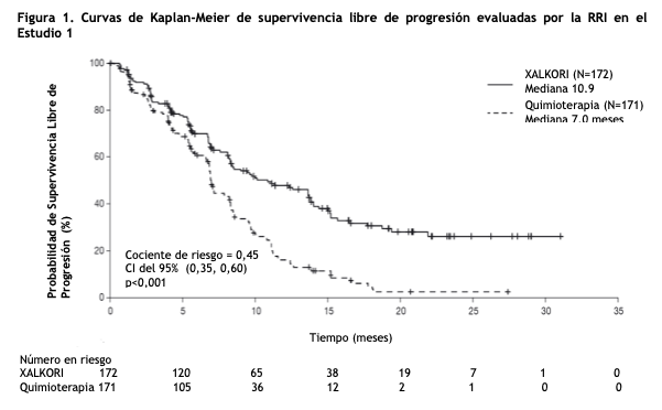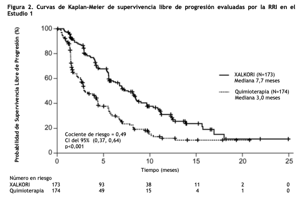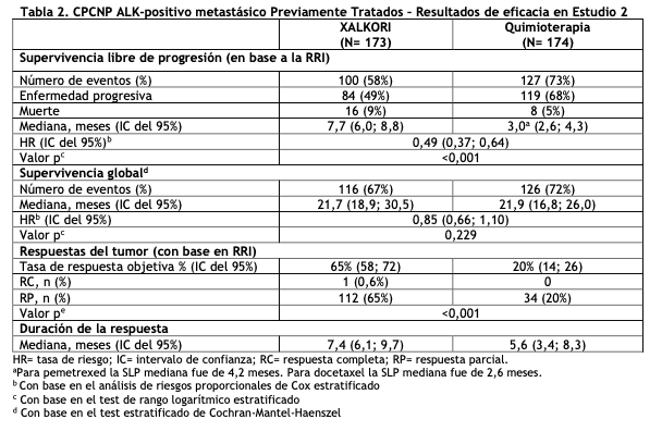 CPCNP ALK-positivo metastásico, previamente tratados - Estudio 2 (Perfil 1007, NCT00932893): Se demostró la eficacia de XALKORI como monoterapia para el tratamiento de 347 pacientes con CPCNP ALK-positivo metastásico, previamente tratados con un régimen quimioterápico basado en platino, en un estudio aleatorizado, multicéntrico, abierto, con control activo (Estudio 2). El resultado principal de eficacia fue la supervivencia libre de progresión (SLP) según RECIST versión 1.1, evaluado por la revisión radiológica independiente (RRI). Los resultados adicionales de eficacia incluyeron la tasa de respuesta objetiva (TRO) según la evaluación de la RRI, Duración de Respuesta (DDR) y supervivencia global (SG). Se aleatorizaron los pacientes para recibir XALKORI 250 mg en forma oral dos veces al día (n= 173) o quimioterapia (n= 174). La quimioterapia consistió en pemetrexed 500 mg/m2 (para pacientes sin tratamiento previo con pemetrexed, n= 99) o docetaxel 75 mg/m2 (n= 72) intravenoso (IV) cada 21 días. Los pacientes en ambas ramas de tratamiento continuaron con el tratamiento hasta la progresión documentada de la enfermedad, intolerancia al tratamiento o hasta que el investigador determinara que el paciente ya no experimentaba un beneficio clínico. La aleatorización se estratificó por el estado de desempeño ECOG (0-1, 2), metástasis cerebrales (presentes, ausentes) y tratamiento previo con un inhibidor de la tirosina quinasa EGFR (sí, no). Era necesario que los pacientes tuvieran un CPCNP ALK- positivo identificado por el ensayo aprobado de la FDA, el kit Vysis ALK Break-Apart FISH Probe, antes de la aleatorización. Las características demográficas de toda la población del estudio fueron de 56% mujeres, mediana de edad 50 años, estado de desempeño basal ECOG 0 o 1 (90%), 52% de raza blanca y 45% asiática, 4% fumadores actuales, 33% ex fumadores y 63% no fumadores. Las características de la enfermedad de la población total fue enfermedad metastásica en al menos 95% de los pacientes y al menos el 93% de los tumores de los pacientes se clasificaron como una histología de adenocarcinoma. Al momento del análisis final de la supervivencia global, 89% de los pacientes aleatorizados al grupo de quimioterapia recibió subsecuentemente XALKORI. El Estudio 2 demostró una mejora estadísticamente significativa en la SLP de los pacientes tratados con XALKORI. La Tabla 2 y la Figura 2 resumen los resultados de eficacia.