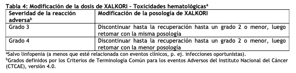 Una vez al mes, deben realizarse hemogramas completos que incluyan un recuento diferencial de leucocitos según la indicación clínica, con un aumento de la frecuencia de repetición de análisis en caso de observarse anomalías de grado 3 ó 4, o en caso de fiebre o infección. Modificación de la dosis en insuficiencia hepática moderada y severa: La dosis recomendada de XALKORI en pacientes con deterioro hepático moderado preexistente (cualquier aspartato aminotransferasa (AST) y bilirrubina total mayor a 1,5 veces el límite superior normal (LSN) y menor o igual a 3 veces el LSN), es de 200 mg orales dos veces al día. La dosis recomendada de XALKORI en pacientes con deterioro hepático severo preexistente (cualquier AST y bilirrubina total mayor a 3 veces el LSN) es de 250 mg oral una vez al día (ver Uso en poblaciones específicas y Propiedades fármacodinámicas). Modificación de la dosis en insuficiencia renal severa: La dosis de XALKORI recomendada en pacientes con deterioro renal severo (depuración de creatinina < 30 ml/min calculada usando la ecuación modificada de Cockcroft-Gault) que no requieren diálisis es de 250 mg vía oral, una vez al día (Ver Uso en poblaciones específicas y Características farmacológicas, Propiedades farmacodinámicas). Modificación de la dosis para el uso concomitante de inhibidores potentes del CYP3A: Se debe evitar el uso concomitante de inhibidores potentes del CYP3A. Si el uso concomitante de inhibidores potentes del CYP3A es inevitable, se debe reducir la dosis de XALKORI a 250 mg por vía oral 1 vez al día (ver Interaccion con otros medicamentos y otras formas de interaccion). Luego de discontinuar el inhibidor potente del CYP3A, se debe iniciar la dosis de XALKORI, utilizada antes de la administración concomitante con el inhibidor potente del CYP3A.