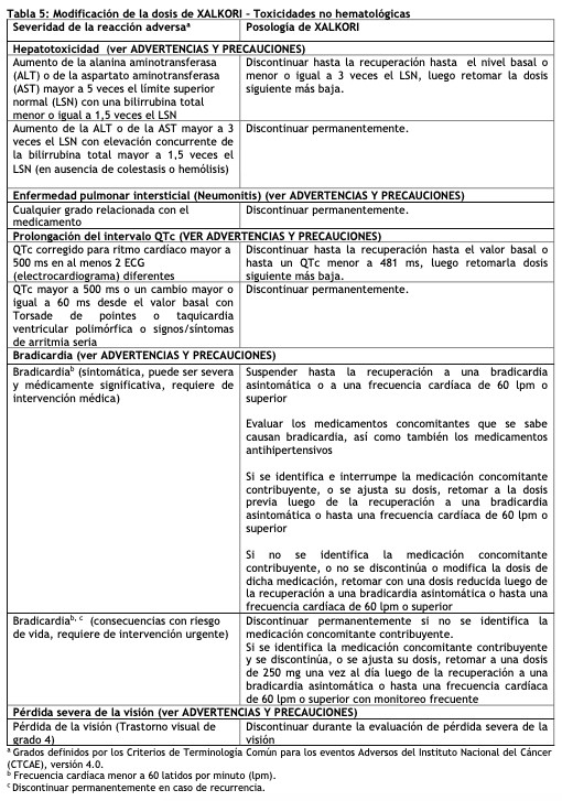 Posología recomendada: La dosis recomendada de XALKORI es de 250 mg por vía oral, con o sin alimentos, dos veces al día hasta la progresión de la enfermedad o hasta que el paciente no lo tolere. Las cápsulas deben ingerirse enteras. En caso de omisión de una dosis de XALKORI, compense dicha dosis, salvo que resten menos de 6 horas hasta la dosis siguiente. Si se producen vómitos luego de la ingesta de una dosis de XALKORI, tome la próxima dosis a la hora habitual. Modificación de la dosis debido a reacciones adversas: Las reducciones de dosis recomendadas se describen a continuación: Primera reducción de dosis: XALKORI 200 mg, vía oral, dos veces al día. Segunda reducción de dosis: XALKORI 250 mg, vía oral, una vez al día. Interrumpa en forma permanente si no puede tolerar XALKORI 250 mg por vía oral, una vez al día. En las tablas 4 y 5, se proporcionan las modificaciones de las dosis a causa de las reacciones adversas con XALKORI.