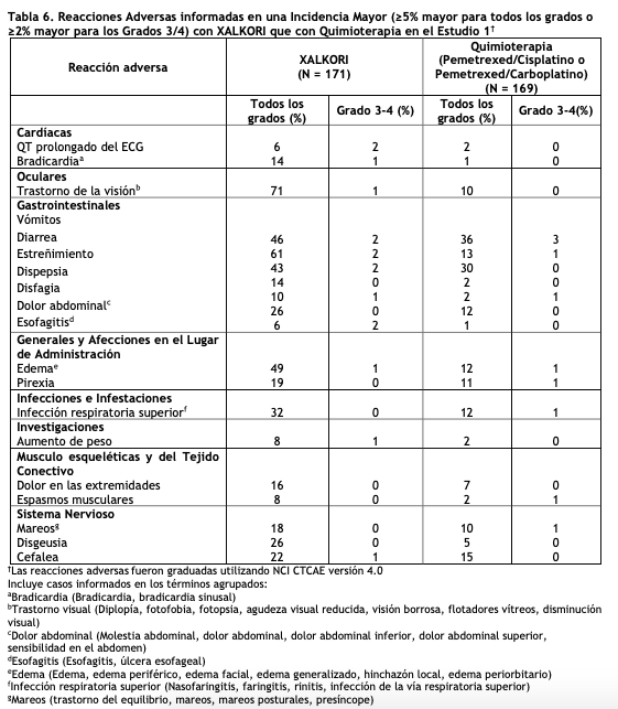 Las siguientes reacciones adversas clínicamente significativas se describen en otras secciones del prospecto: Hepatotoxicidad (ver Advertencias y precauciones). Enfermedad pulmonar intersticial/neumonitis (ver Advertencias y precauciones). Prolongación del intervalo QTc (ver Advertencias y precauciones). Bradicardia (ver Advertencias y precauciones). Pérdida severa de la visión (ver Advertencias y precauciones). Experiencia en ensayos clínicos: Dado que los estudios clínicos se realizan en condiciones muy variadas, las tasas de reacciones adversas observados en los ensayos clínicos de un medicamento no pueden compararse directamente a las tasas en estudios clínicos de otro medicamento y es posible que no reflejen las tasas observadas en la práctica clínica. Los datos en Advertencias y precauciones reflejan la exposición a XALKORI en 1719 pacientes que recibieron XALKORI 250 mg dos veces al día incluidos en los Estudios 1 (incluyendo 109 pacientes adicionales que cruzaron desde el brazo de control), 2, 3, un ensayo de un solo brazo (n = 1063) de CPCNP ALK positivo, y un cohorte de expansión de estudio de hallazgo de dosis en pacientes con CPCNP (n = 154). La data descripta abajo se basa principalmente en 343 pacientes con CPCNP ALK-positivo metastásico que recibieron XALKORI a una dosis de 250 mg dos veces al día por vía oral, en dos ensayos abiertos aleatorizados, controlados con principio activo (Estudios 1 y 2). La seguridad de XALKORI fue también evaluada en 50 pacientes con CPCNP metastásico ROS1 positivo de un estudio de un solo brazo (Estudio 3). Las reacciones adversas más comunes (≥25%) de XALKORI son trastornos visuales, diarrea, vómitos, constipación, edema, elevación de las transaminasas, fatiga, infección respiratoria superior, disminución del apetito, mareos Y neuropatía. Estudio 1 de CPCNP Metastásico ALK-positivo Sin Tratamiento Previo (Perfil 1014): Los datos en la Tabla 6 derivan de 340 pacientes con CPCNP metastásico ALK-positivo que no hayan estado bajo tratamiento sistémico previo para la enfermedad avanzada que recibieron tratamiento en un ensayo aleatorizado, multicéntrico, controlado con principio activo y abierto (Estudio 1). Los pacientes en el grupo de XALKORI (n=171) recibieron XALKORI 250 mg oralmente dos veces por día hasta que se documentó la progresión de la enfermedad, la intolerancia al tratamiento, o que el investigador determinó que el paciente no presentaba más beneficios clínicos. Un total de 169 pacientes en el grupo de quimioterapia recibieron 500 mg/m2 de pemetrexed con cisplatino 75 mg/m2 (n=91) o carboplatino a una dosis calculada para producir un área bajo la curva de concentración-tiempo (ABC) de 5 o 6 mg·min/mL (n=78). La quimioterapia se administró mediante infusión intravenosa cada 3 semanas por hasta 6 ciclos, en ausencia de toxicidades limitantes de la dosis relacionadas con la quimioterapia. Luego de los 6 ciclos, los pacientes permanecieron en el estudio sin tratamientos anti-cáncer adicionales, y las evaluaciones de los tumores continuaron hasta que se documentó la progresión de la enfermedad. La duración mediana del tratamiento del estudio fue de 10,9 meses para los pacientes del grupo que recibió XALKORI y de 4,1 meses para los pacientes del grupo que recibió quimioterapia. La mediana de la duración del tratamiento fue de 5,2 meses para pacientes que recibieron XALKORI luego del cruce desde quimioterapia. Entre los 340 pacientes que fueron tratados en el Estudio 1, la edad mediana era de 53 años; 16% de los pacientes eran mayores de 65 años. Un total del 62% de los pacientes eran mujeres y el 46% provenían de Asia. Se informaron reacciones adversas graves en 34% de los pacientes tratados con XALKORI. Las reacciones adversas graves más frecuentes informadas en pacientes tratados con XALKORI fueron disnea (4,1%) y embolia pulmonar (2,9%). Las reacciones adversas mortales en pacientes tratados con XALKORI ocurrieron en 2,3% pacientes, que comprendían: shock séptico, insuficiencia respiratoria aguda, y cetoacidosis diabética. Se requirieron reducciones de la dosis debido a las reacciones adversas en el 6% de los pacientes tratados con XALKORI. Las reacciones adversas más frecuentes que dieron lugar a la reducción de la dosis en los pacientes tratados con XALKORI fueron náuseas (1,8%) y elevación de transaminasas (1,8%). La interrupción del tratamiento en pacientes tratados con XALKORI por reacciones adversas fue del 8%. Las reacciones adversas más frecuentes que dieron lugar a la interrupción en pacientes tratados con XALKORI fueron elevación de transaminasas (1,2%), hepatotoxicidad (1,2%) y EPI (1,2%). Las Tablas 6 y 7 resumen las Reacciones Adversas comunes y las Anormalidades del Laboratorio en pacientes tratados con XALKORI.