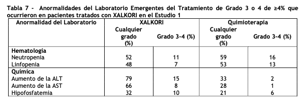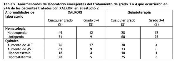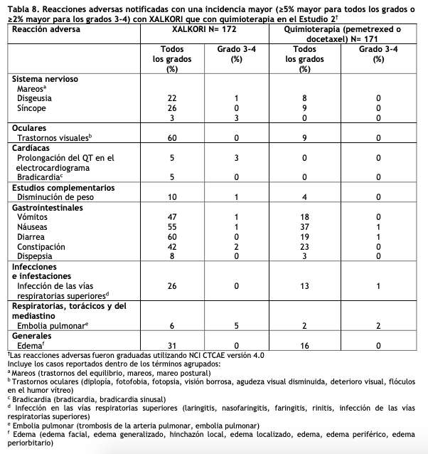 Una anormalidad adicional en pruebas de laboratorio en los pacientes tratados con XALKORI fue un aumento en la creatinina (Cualquier grado: 99%, Grado 3: 2%, Grado 4: 0%) en comparación con el grupo de quimioterapia (Cualquier grado: 92%, Grado 3: 0%, Grado 4: 1%). Estudio 2 de CPCNP ALK-positivo metastásico con tratamiento previo (Perfil 1007): Los datos en la Tabla 8 provienen de 343 pacientes con CPCNP ALK-positivo metastásico enrolados en un ensayo (Estudio 2) aleatorizado, multicéntrico, abierto y con control activo. Los pacientes en la rama de XALKORI (n= 172) recibieron XALKORI 250 mg vía oral dos veces al día hasta una progresión documentada de la enfermedad, intolerancia al tratamiento o hasta que el investigador determinó que el paciente ya no experimentaba un beneficio clínico. Un total de 171 pacientes en la rama de quimioterapia recibieron pemetrexed 500 mg/m2 (n= 99) o docetaxel 75 mg/m2 (n=72) mediante infusión intravenosa cada tres semanas hasta una progresión documentada de la enfermedad, intolerancia al tratamiento o hasta que el investigador determinó que el paciente ya no experimentaba un beneficio clínico. Los pacientes en la rama de quimioterapia recibieron pemetrexed a menos que hubieran recibido pemetrexed como parte de un tratamiento de primera línea o mantenimiento. La duración mediana del tratamiento del estudio fue de 7,1 meses para los pacientes que recibieron XALKORI y 2,8 meses para los pacientes que recibieron quimioterapia. A lo largo de los 347 pacientes que fueron aleatorizados al tratamiento del estudio (343 recibieron al menos una dosis del tratamiento del estudio), la edad mediana fue de 50 años; 14% de los pacientes fueron mayores de 65 años. Un total de 56% de los pacientes fueron mujeres y 45% de los pacientes fueron asiáticos. Se reportaron reacciones adversas serias en 37% de los pacientes tratados con XALKORI y en 23% de los pacientes en el grupo de quimioterapia. Las reacciones adversas serias más frecuentes notificadas en pacientes tratados con XALKORI fueron neumonía (4,1%), embolia pulmonar (3,5%), disnea (2,3%) y enfermedad pulmonar intersticial (EPI: 2,9%). En5% de los pacientes tratados con XALKORI en el Estudio 2, ocurrieron reacciones adversas mortales: síndrome de distrés respiratorio agudo, arritmias, disnea, neumonía, neumonitis, embolia pulmonar, EPI, insuficiencia respiratoria y sepsis. Se requirieron reducciones de dosis debidas a reacciones adversas en el 16% de los pacientes tratados con XALKORI. Las reacciones adversas más frecuentes que dieron lugar a la reducción de la dosis en los pacientes tratados con XALKORI fueron aumento (8%) de la alanina aminotransferasa (ALT) incluidos algunos pacientes con aumento concurrente de la aspartato aminotransferasa (AST), prolongación del intervalo QTc (2,9%) y neutropenia (2,3%). La discontinuación del tratamiento en pacientes tratados con XALKORI debido a reacciones adversas fue del 15,0%. Las reacciones adversas más frecuentes que condujeron a la discontinuación en pacientes tratados con XALKORI fueron EPI (1,7%), aumento de ALT y AST (1,2%), disnea (1,2%), y embolia pulmonar (1,2%). Las Tablas 8 y 9 resumen las reacciones adversas comunes y las anormalidades de laboratorio en los pacientes tratados con XALKORI.